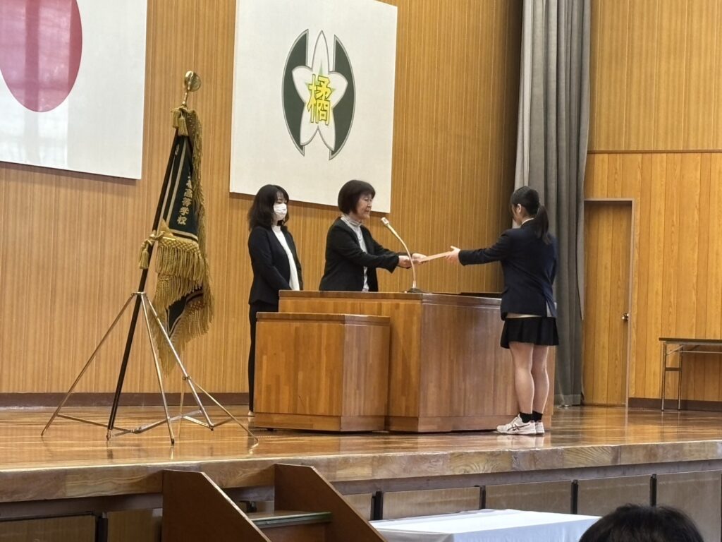 続いて幹事委嘱をしました。新入会員269名を代表し、朝倉ひまりさんが新幹事挨拶、そして、記念品(卒業証書ホルダー)を加藤凜さんが受け取り、入会式を終えました。